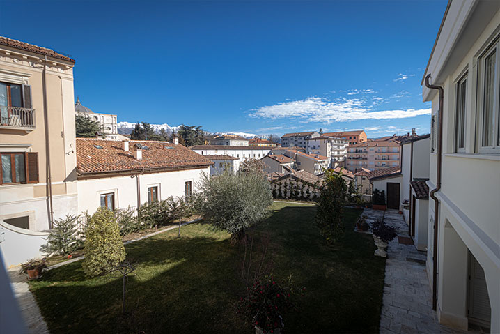 La stanza ha una vista esclusiva sul centro storico della città e sul Gran Sasso. Affaccia sul giardino pensile interno che gode della vista della Basilica di San Bernardino.